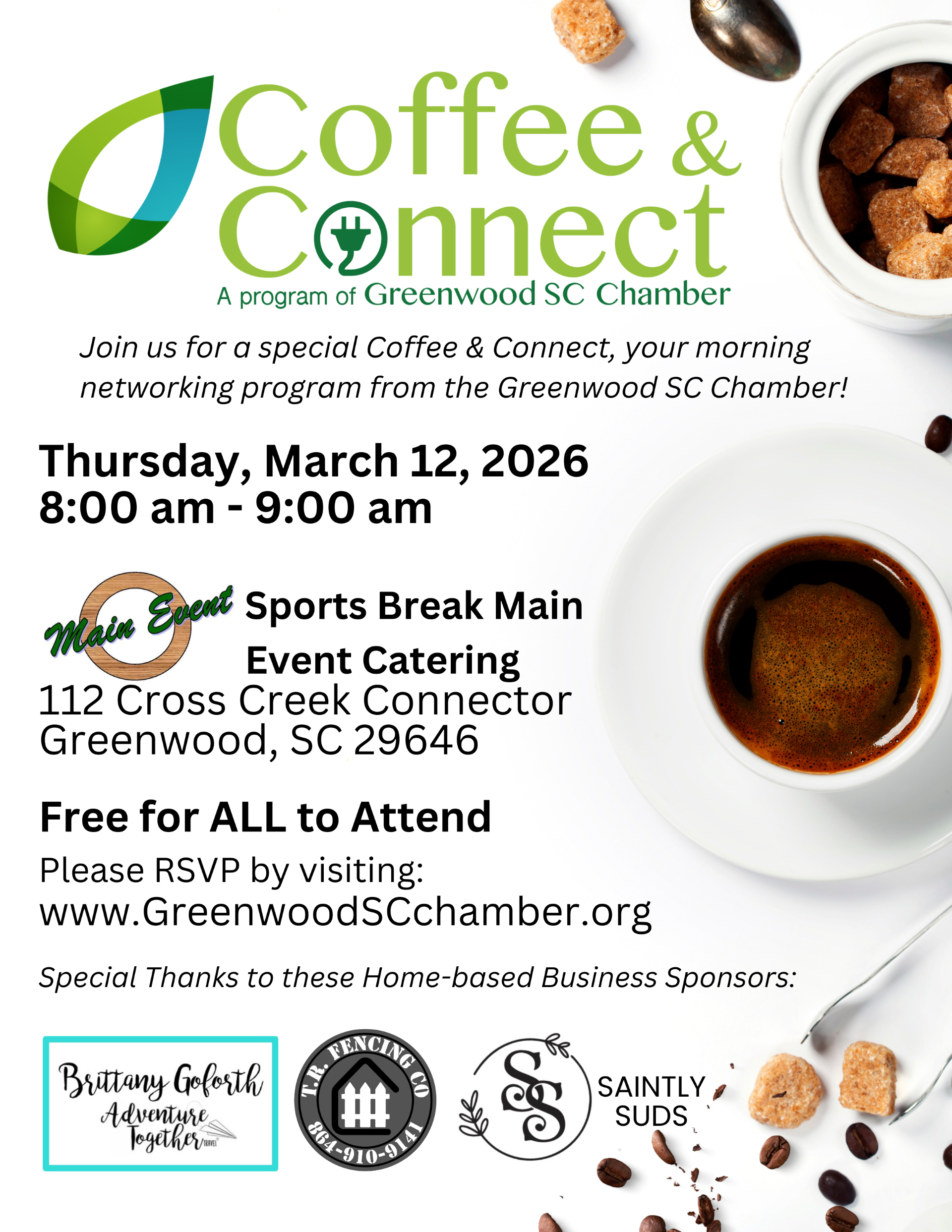 Join us for a special Coffee & Connect at Main Event Catering! our host Main Event Catering will be celebrating the grand opening of their new take-out service with a ribbon cutting! This event will also feature three exciting Chamber member At-Home businesses celebrating their official ribbon cuttings.