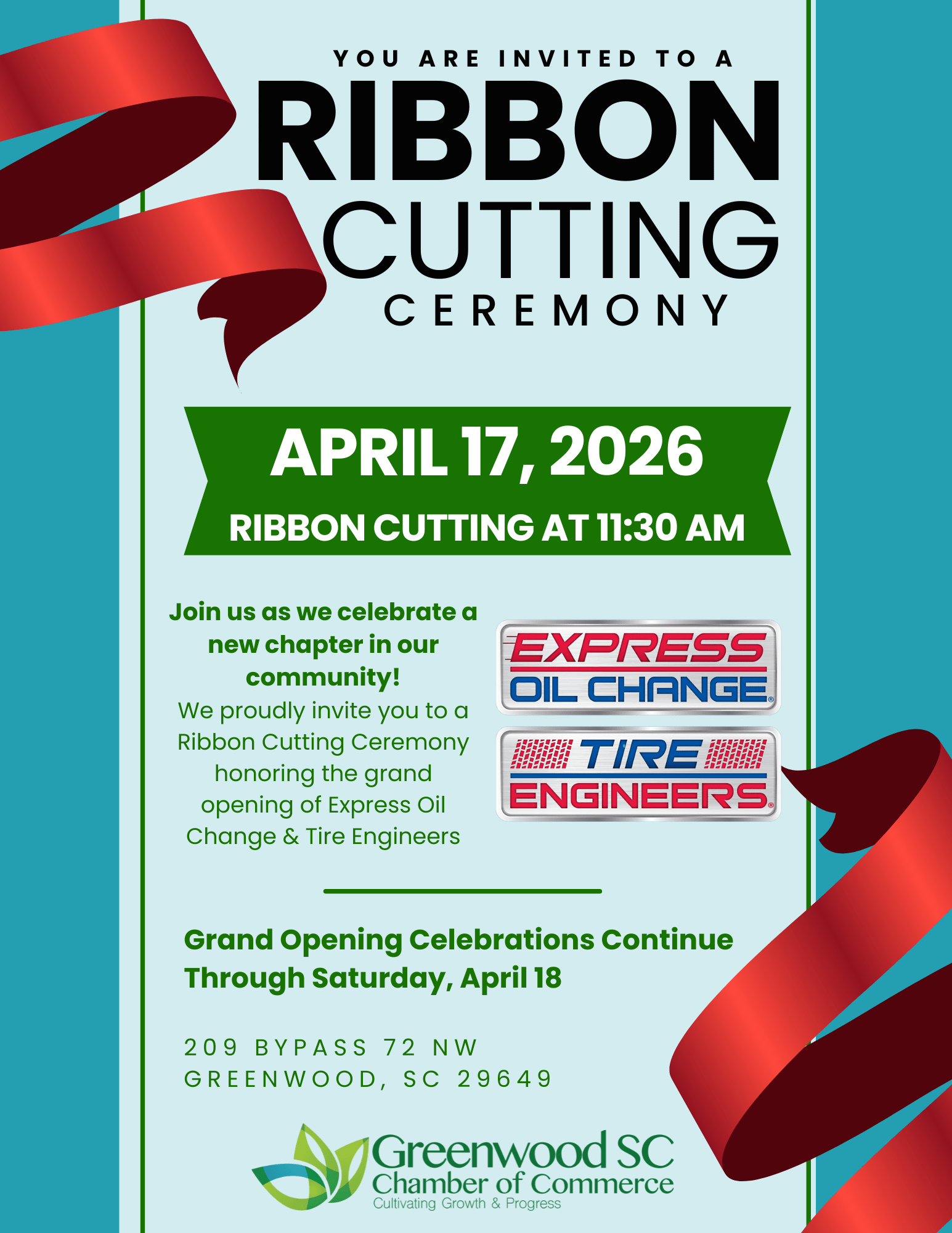 DESCRIPTION:a {    text-decoration: none\;    color: #464feb\; }\ntr th\, tr td {    border: 1px solid #e6e6e6\; }\ntr th {    background-color: #f5f5f5\; }\n\na {    text-decoration: none\;    color: #464feb\; }\ntr th\, tr td {    border: 1px solid #e6e6e6\; }\ntr th {    background-color: #f5f5f5\; }\n\na {    text-decoration: none\;    color: #464feb\; }\ntr th\, tr td {    border: 1px solid #e6e6e6\; }\ntr th {    background-color: #f5f5f5\; }\n There's nothing better than celebrating new growth in Greenwood!\nHelp us welcome Express Oil & Tire Exchange as they open their doors at their beautiful new Greenwood location.\nLet's gather Friday at 11:30 to cut the ribbon\, celebrate together\, and officially welcome them to the Greenwood family!