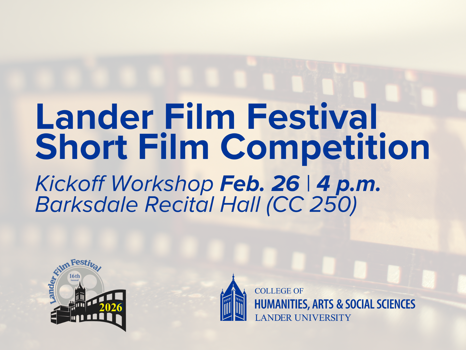 Lander University’s College of Humanities, Arts, and Social Sciences is launching the 16th annual Lander Film Festival with its Short Film Competition Kickoff Workshop on Thursday, February 26 at 4 p.m. The workshop will be held in Barksdale Recital Hall (CC 250).