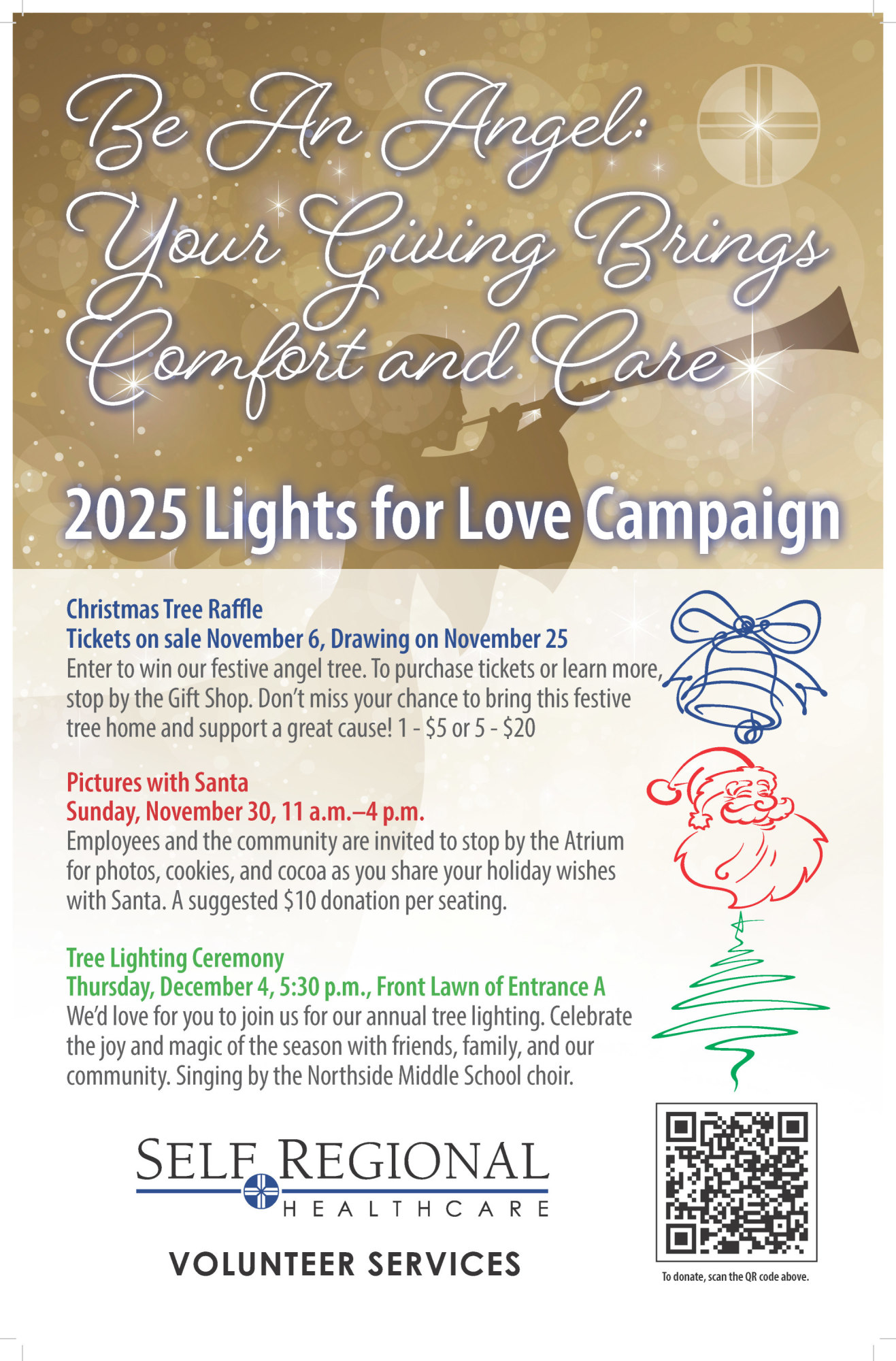 Join us for the Annual Holiday Tree Lighting and support the 2025 Lights for Love Campaign. Your generous donations will go directly to Volunteer Services at Health Regional, helping rebuild the pediatric playroom recently damaged by flooding. Together, we can restore a space where children find joy and comfort—and brighten lives one donation at a time.