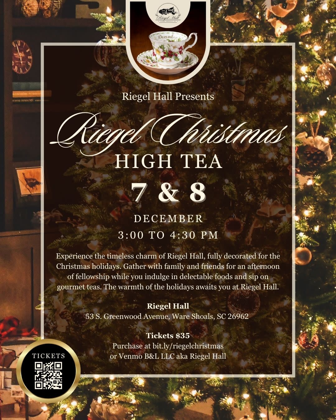 Experience the timeless charm of Riegel Hall at our ‘Christmas High Tea.’ Join us for an afternoon tea on either Saturday, December 7th, or Sunday, December 8th, 2024. Enjoy the beautiful Christmas decorations while savoring snacks and a variety of teas, all within the elegant Riegel Hall mansion in Ware Shoals, SC.