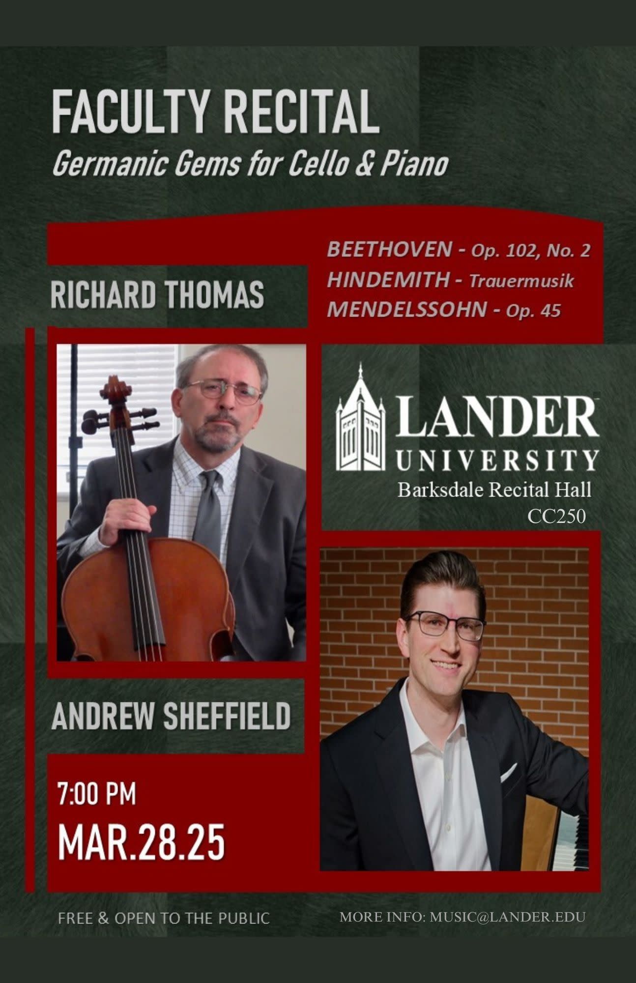 GREEWOOD, S.C.— Lander University will host a “Germanic Gems for Piano and Cello” in Barksdale Retail Hall at 7 p.m. March 28. This event is free and open to the public. Faculty members Richard Thomas and Andrew Sheffield will perform music composed by Ludwig van Beethoven, Paul Hindemith and Feliz Mendelssohn.