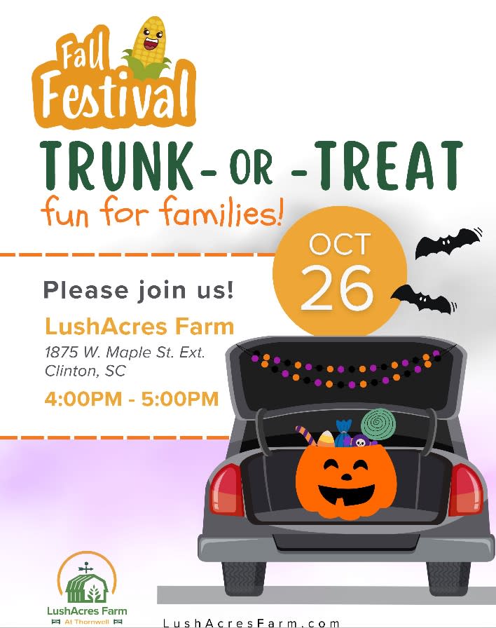 We invite you to join us for the exciting conclusion of our 2024 Fall Festival on October 26th, featuring Trunk or Treating from 4-5 pm. All trick-or-treaters are welcome to participate, or you can bring your creatively decorated car/trunk to distribute candy. For further details, please reach out to our Community Engagement Coordinator, Becca Dobbins, at BDobbins@Thornwell.org.