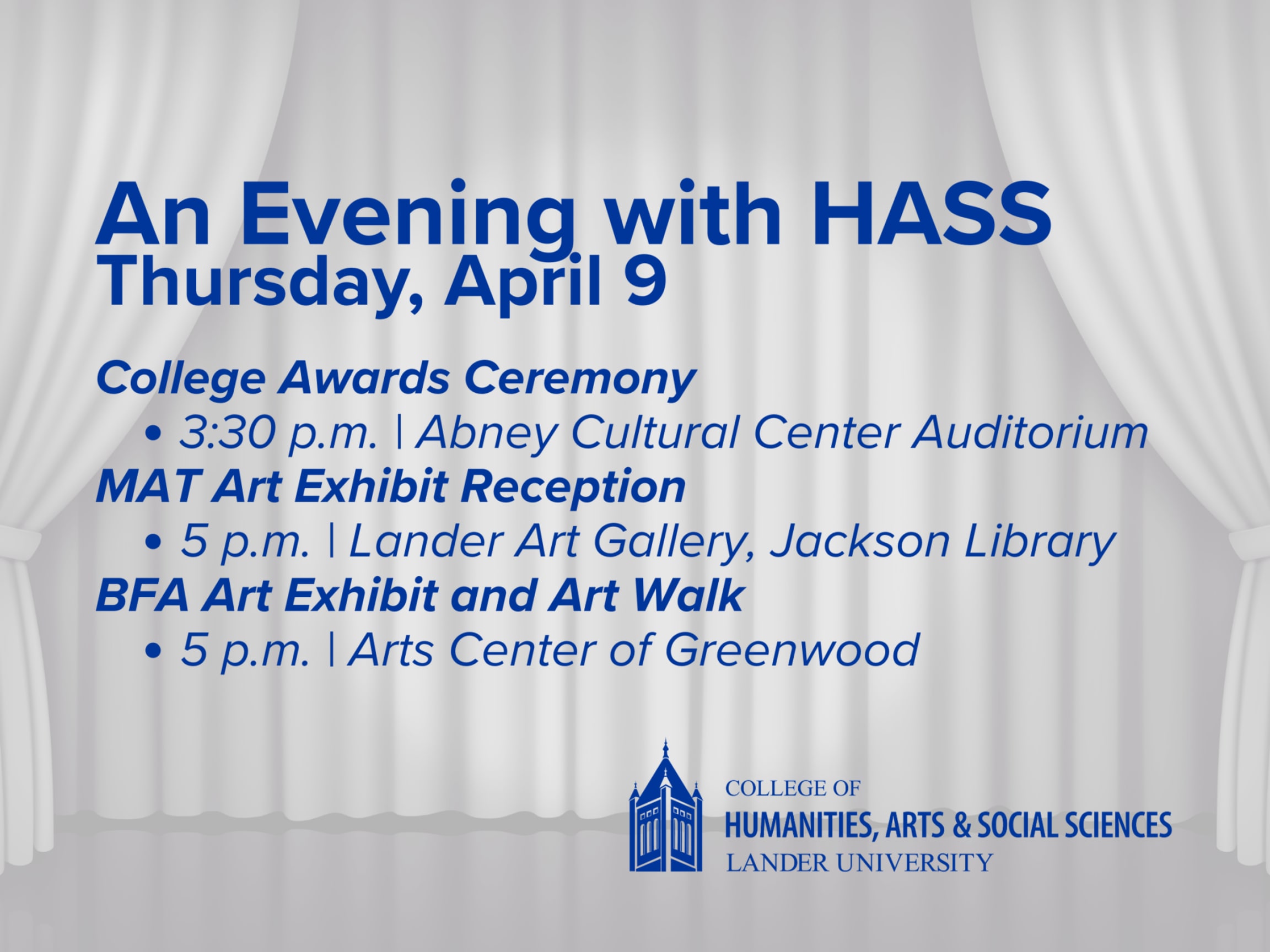 DESCRIPTION:Lander University College of Humanities\, Arts and Social Sciences will host "An Evening With HASS" honoring and highlighting the student achievements of this academic year. The College of Humanities\, Arts and Social Sciences will be hosting the HASS Awards Ceremony April 9th at 3:30 in the Abney Cultural Center Auditorium.  -----On the same day\, the MAT Art Exhibition will be hosted in the New Lander Art Gallery at 5 p.m.\, and the BFA Art Exhibit and Art Walk will also be hosted on the same day and time at the Arts Center of Greenwood. All three events are free and open to the public.