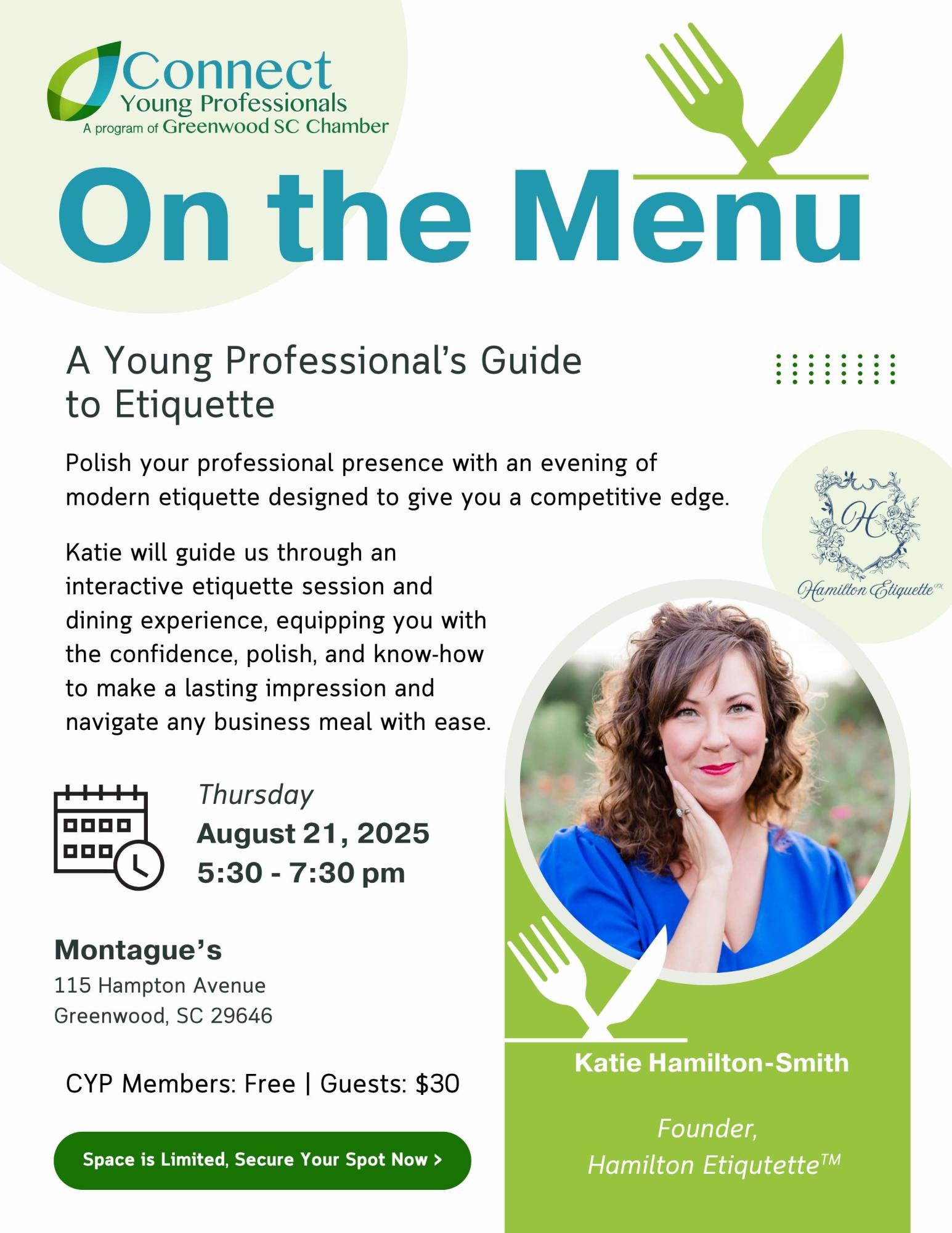 The Connect Young Professionals (CYP) is a program sponsored by the Greenwood SC Chamber of Commerce. Since 2007, CYP has provided opportunities for professionals, ages 21-39, to network and educate themselves on important issues facing Greenwood County.