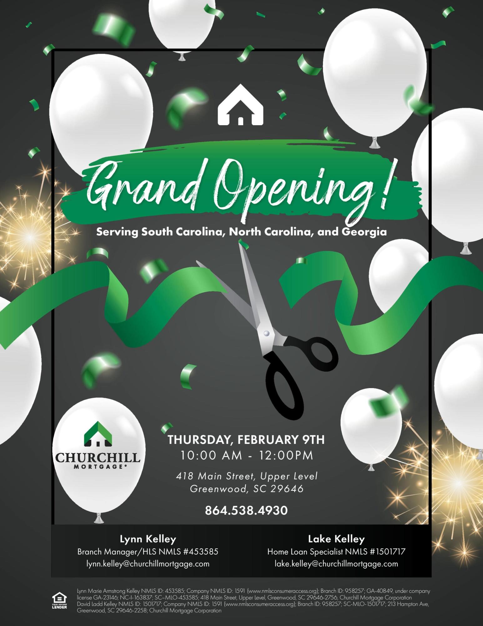 Celebrate the Grand Re-Opening of Churchill Mortgage in Greenwood on Thursday, February 9th from 10:00 AM - 12:00 PM! The Chamber will be on-site at 9:30 for a ribbon cutting!