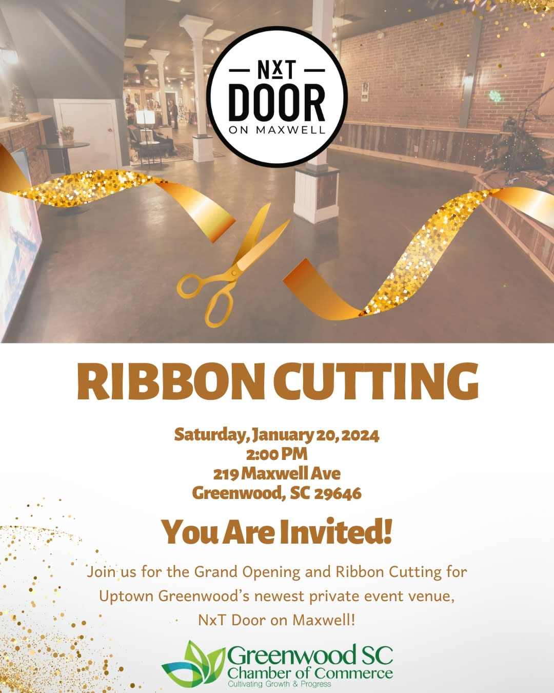 You are invited to Nxt Door on Maxwell's Ribbon Cutting! Please register if you would like to receive a reminder email about the ribbon cutting 24 hours in advance.